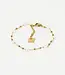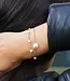 Stalen schakelarmband, fijn verguld met goud, subtiel bezaaid met kleine gouden bolletjes en handgeslepen fijne stenen. Lees meer..
