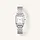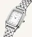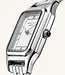 Het horloge onderscheidt zich door zijn unieke rechthoekige, achthoekige kast met compacte afmetingen (meestal 21 x 26 mm). De echte blikvanger is de wijzerplaat, die wordt omlijst door een dubbel zilverkleurige frame. Dit detail geeft het horloge een luxe, gelaagde en verfijnde uitstraling.