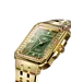 De groene wijzerplaat wordt omlijst door een bezel met fonkelende zirkonia’s, wat dit horloge een luxueuze uitstraling geeft. De goudkleurige band is zorgvuldig afgewerkt met matte en gepolijste schakels. Dankzij saffierglas en 5 ATM waterdichtheid combineert dit horloge elegantie met betrouwbaarheid.