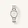De slanke, vierkante horlogekast van 25x25 mm is slechts 6.5 mm dik en straalt tijdloze klasse uit door de warme, zilveren afwerking van messing. De matte crèmekleurige wijzerplaat vormt een prachtig contrast met de verfijnde, gouden Romeinse cijfers, wat zorgt voor een klassieke en goed leesbare uitstraling.