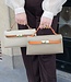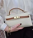 Langwerpige handtas met klepconstructie, contrasterende band met draaisluiting en vaste handgreep. Strak silhouet met stevige vorm, geschikt voor dagelijks en gekleed gebruik. Lees meer..